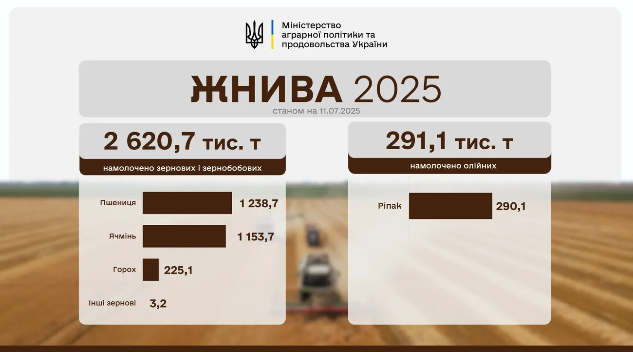 Станом на 11 липня 2025 року в Україні обмолочено 919,9 тис. га ранніх зернових та зернобобових культур, намолочено 2 620,7 тис.
